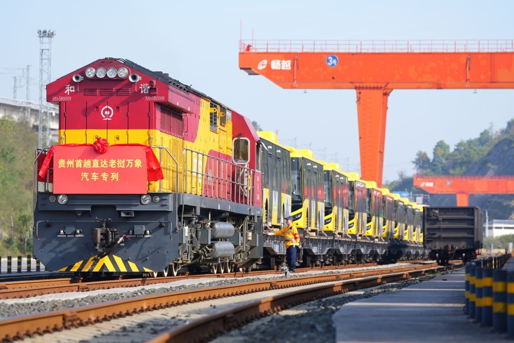 2024年10月28日,裝載著28輛“貴州造”新能源客車的出口專列停靠在貴陽國際陸港都拉營站,準備經由云南磨憨口岸出境前往老撾萬象。這是貴州的中老班列首次整列直發(fā),也是貴州本土生產的新能源客車首次出口老撾。
