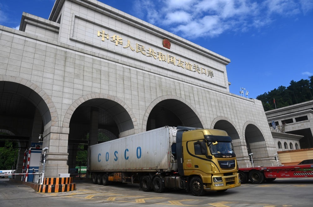 2024年8月26日,一輛貨車通過廣西憑祥友誼關口岸。友誼關口岸是西部陸海新通道的重要節(jié)點,是中國通往東盟最大的陸路口岸,也是我國通往越南最便捷的陸路大通道之一。滿載著東盟國家特色水果、農副產品與中國電子配件、大型設備等貨品的車輛在此“雙向奔赴”、川流不息。2024年,友誼關口岸年內出入境貨車數量首次突破50萬輛次,同比增長15.96%,創(chuàng)歷史新高。