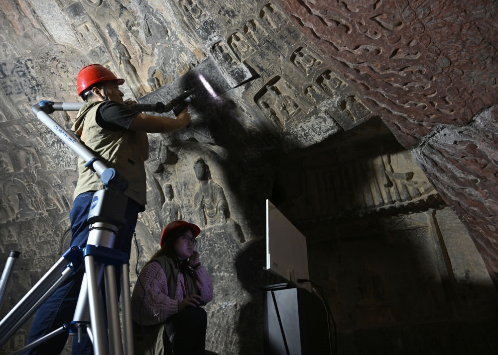 2025年4月9日,龍門石窟研究院工作人員在古陽洞使用關(guān)節(jié)臂掃描儀對像龕進(jìn)行數(shù)字化掃描。