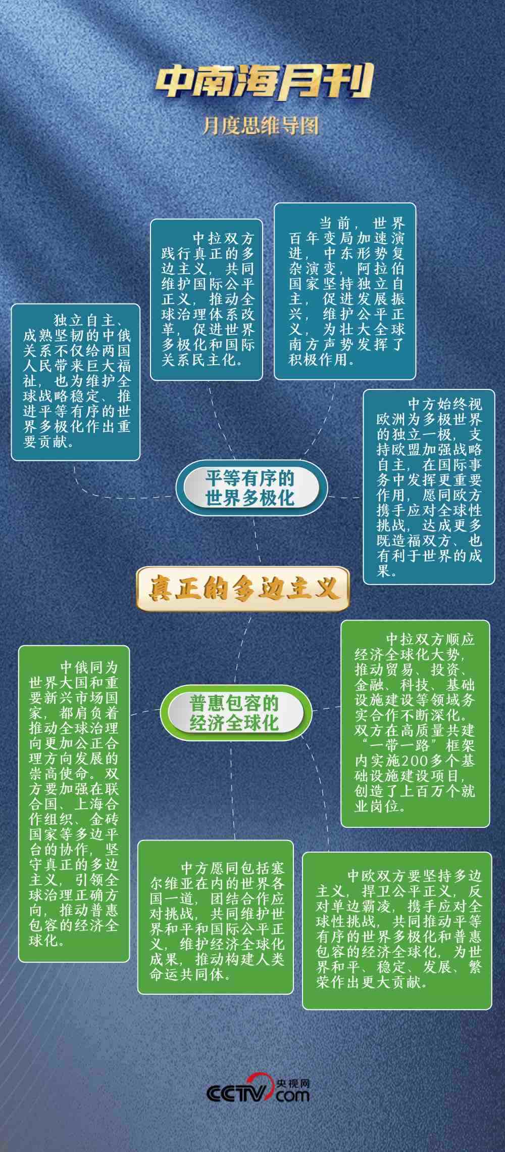 面對(duì)單邊主義逆流,堅(jiān)定不移推動(dòng)平等有序的世界多極化。不為一時(shí)一事所惑,不為風(fēng)高浪急所擾,與俄方達(dá)成“共同弘揚(yáng)正確二戰(zhàn)史觀,維護(hù)聯(lián)合國權(quán)威和地位,維護(hù)國際公平正義”的共識(shí);與歐盟“深化戰(zhàn)略溝通,增進(jìn)理解互信,鞏固伙伴定位”;同拉方攜手啟動(dòng)團(tuán)結(jié)、發(fā)展等五大工程,推動(dòng)中國同全球南方國家相互支持、團(tuán)結(jié)合作。