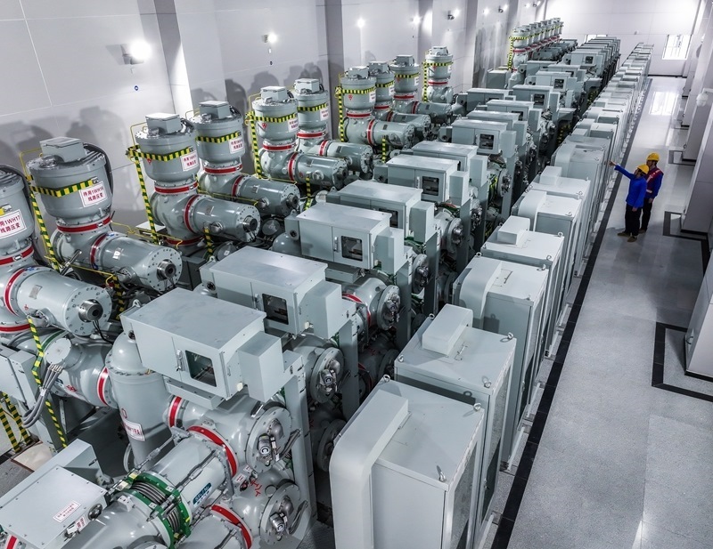 6月24日,在舟山望海(金塘)220千伏輸變電工程的變電站GIS室內,工作人員進行投運前的巡檢(無人機照片)。