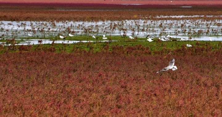 2024年9月14日,海鳥在遼寧省錦州市凌海市紅海灘國家風(fēng)景廊道紅海灘上空飛翔。新華社記者 周華 攝