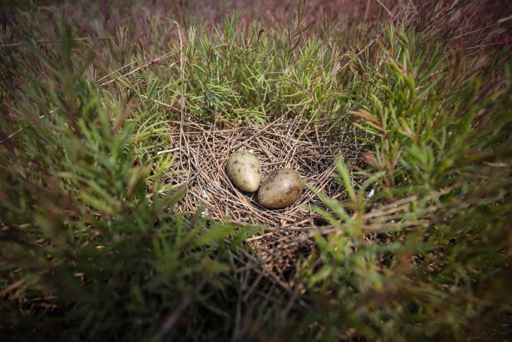 在遼河口國家級自然保護(hù)區(qū)南小河保護(hù)站附近的濕地,黑嘴鷗巢中有待孵化的蛋(2022年6月17日攝)。新華社記者 潘昱龍 攝