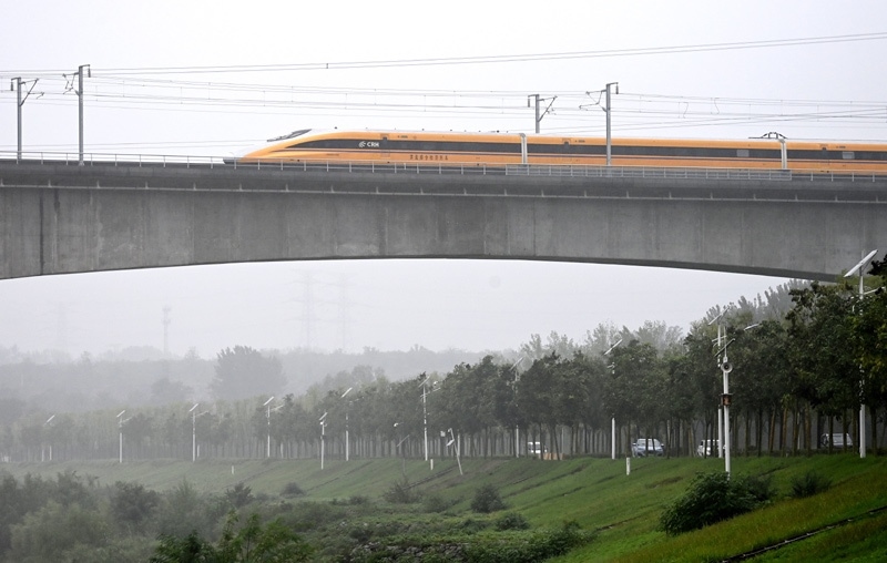 9月11日,聯(lián)調(diào)聯(lián)試綜合檢測列車駛過位于陜西省西安市的西延高鐵渭河特大橋。