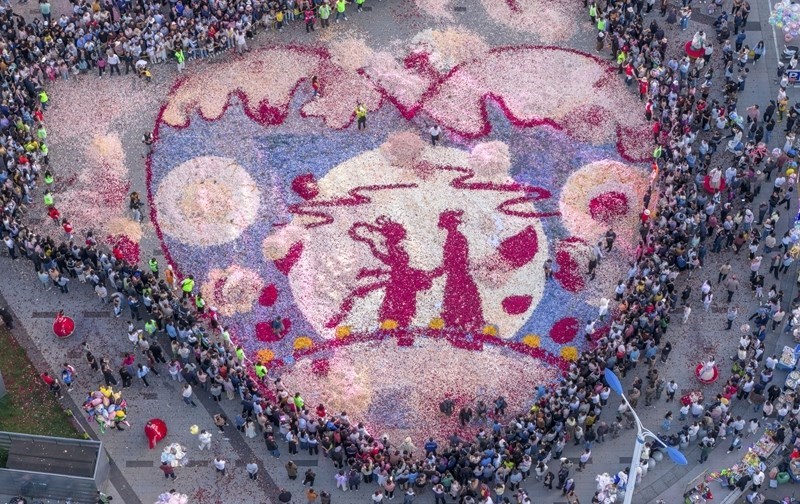 8月29日七夕節(jié),人們在云南省昆明市晉寧區(qū)觀看用玫瑰花瓣鋪就的巨幅圖景《云間鵲橋·花雨鋪路》(無人機(jī)照片)。