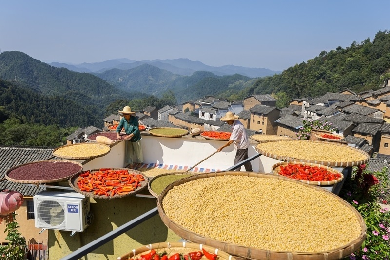 秋收時(shí)節(jié),在安徽省黃山市歙縣深渡鎮(zhèn)陽(yáng)產(chǎn)村,村民利用晴好天氣,抓緊晾曬收獲的辣椒、玉米、山核桃等農(nóng)作物,描繪出一幅山村“曬秋”圖。