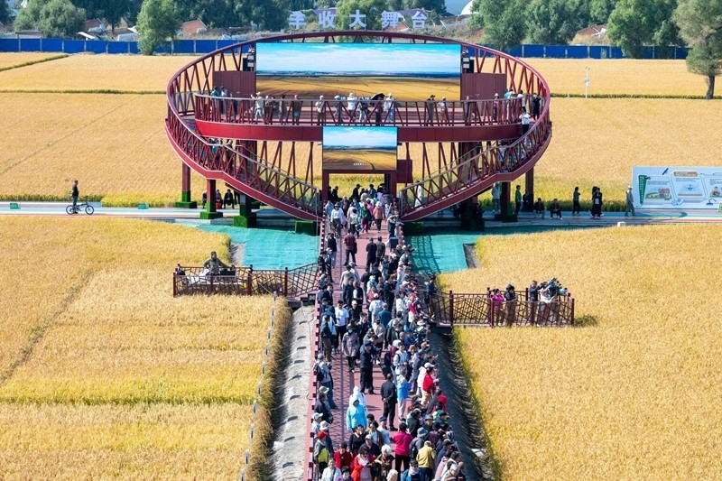 9月23日,2025年中國農(nóng)民豐收節(jié)黑龍江省主場活動在北大荒農(nóng)墾集團(tuán)閆家崗農(nóng)場稻田藝術(shù)公園拉開帷幕,人們歡聚一堂,共享一場同耕耘、共歡歌的豐收盛宴。