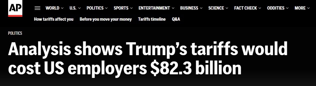 4月份,特朗普政府宣布所謂“對等關(guān)稅”政策后,金融市場出現(xiàn)恐慌。隨后,又設(shè)定了90天談判期,期間多數(shù)進口商品面臨10%基準稅率。報道稱,若4月2日的初始關(guān)稅維持不變,研究中所涉及的企業(yè)將承受更為高昂的1876億美元的額外成本。若按照現(xiàn)行稅率,823億美元成本平均到每位員工身上就是2080美元,相當于年均薪資的3.1%。這一平均值涵蓋了無進口業(yè)務(wù)與有進口業(yè)務(wù)企業(yè)。
