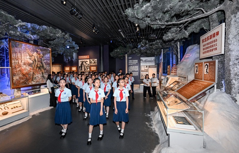 7月7日,北京市第十二中學(xué)的少先隊(duì)員在中國(guó)人民抗日戰(zhàn)爭(zhēng)紀(jì)念館向抗戰(zhàn)英烈獻(xiàn)花。