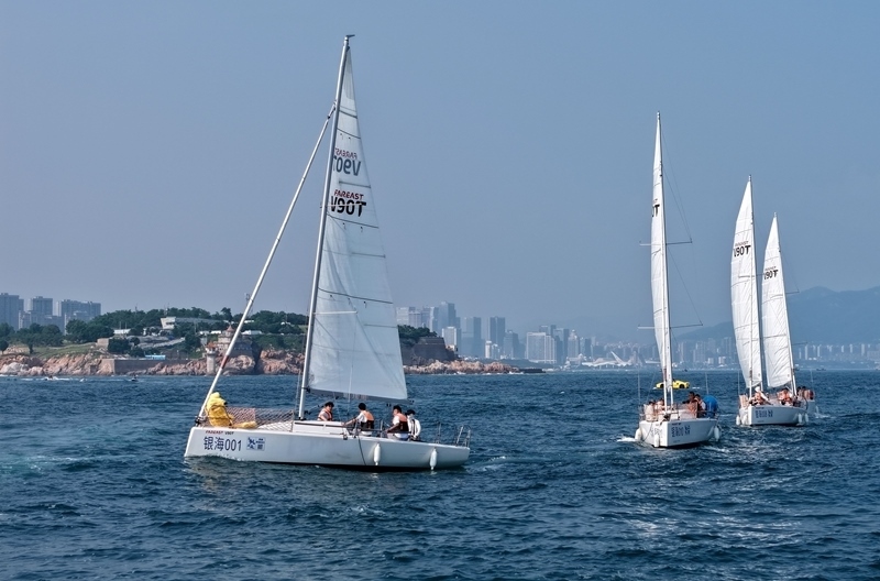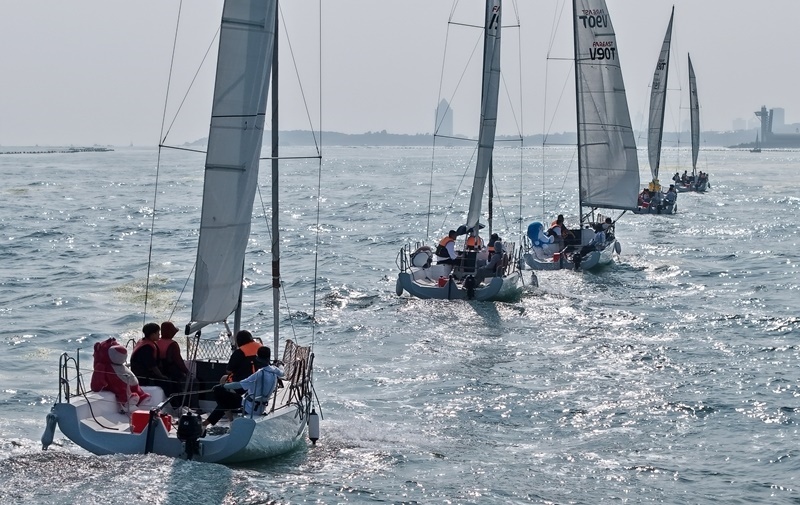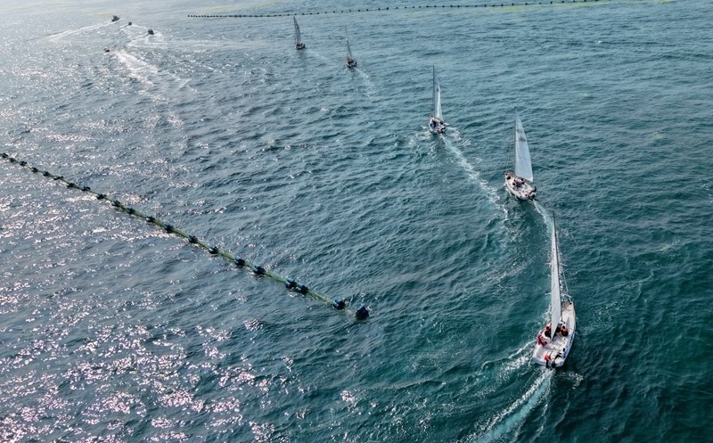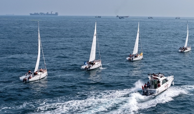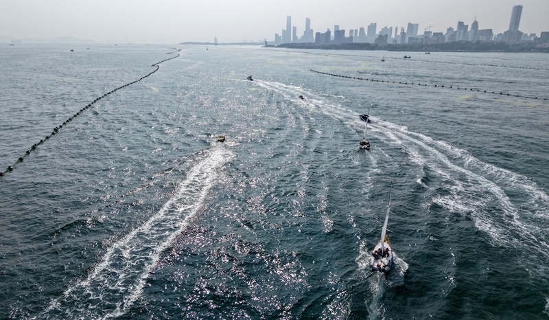 青島小麥島附近海域,市民和游客乘坐帆船參加海上巡游活動(7月10日攝,無人機(jī)照片)。