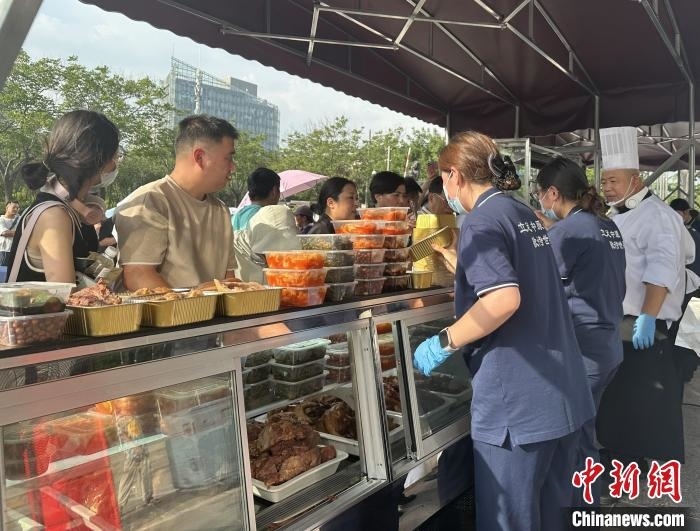近日傍晚,該酒店外擺攤位推出了熟食、涼菜、主食及高檔特色菜,攤位前排起長隊。四五十位酒店服務人員統(tǒng)一身著工作服,忙著招呼顧客。