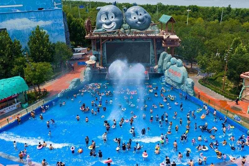 7月12日,人們在天津濱海新區(qū)方特水上樂園戲水納涼。