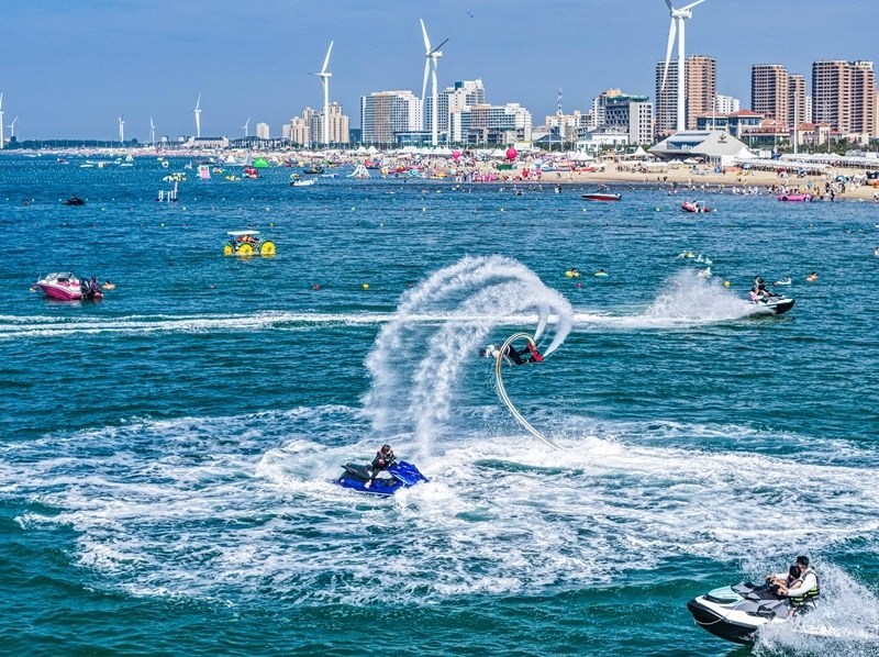 7月12日,在山東省榮成市那香海景區(qū),游客享受海上旅游項目帶來的清涼與歡樂(無人機(jī)照片)。