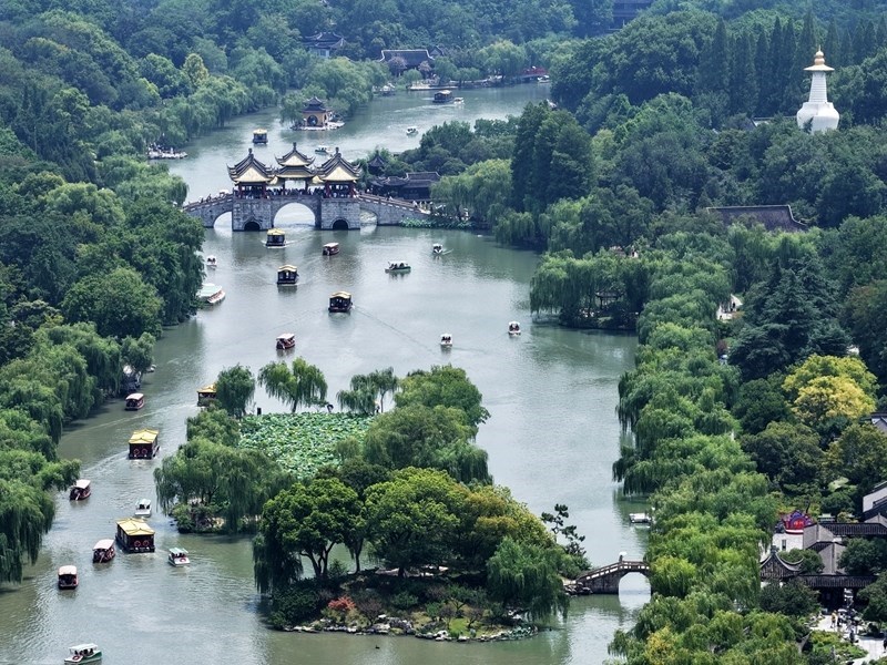 7月13日,游客乘坐游船在江蘇揚州瘦西湖風(fēng)景區(qū)游覽(無人機(jī)照片)。