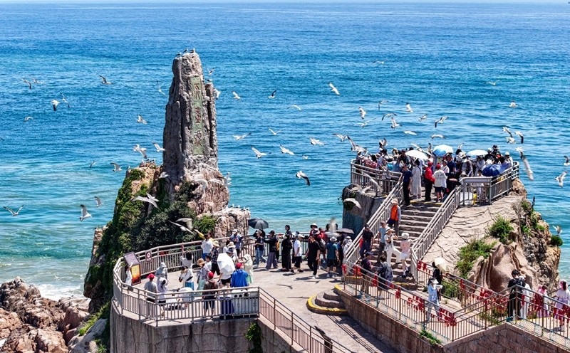 7月12日,山東省榮成市成山頭風(fēng)景區(qū),游客與黑尾鷗互動(無人機(jī)照片)。