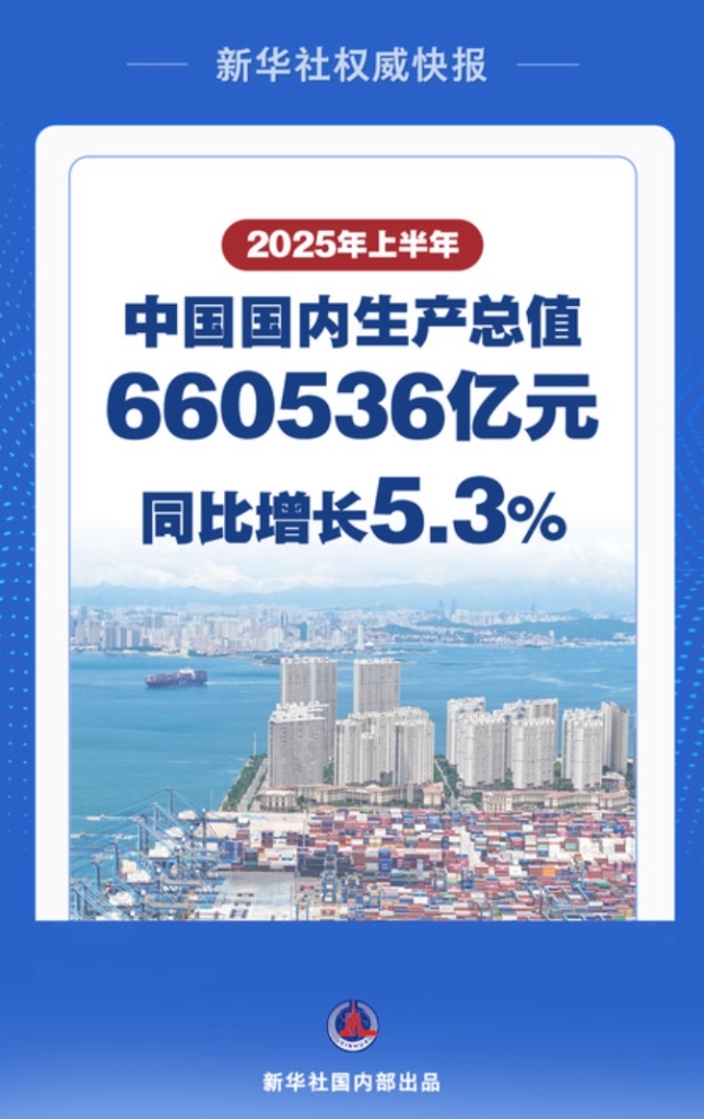 7月15日,國家統(tǒng)計局發(fā)布數(shù)據(jù)顯示,上半年,中國國內生產(chǎn)總值(GDP)660536億元,按不變價格計算,同比增長5.3%。