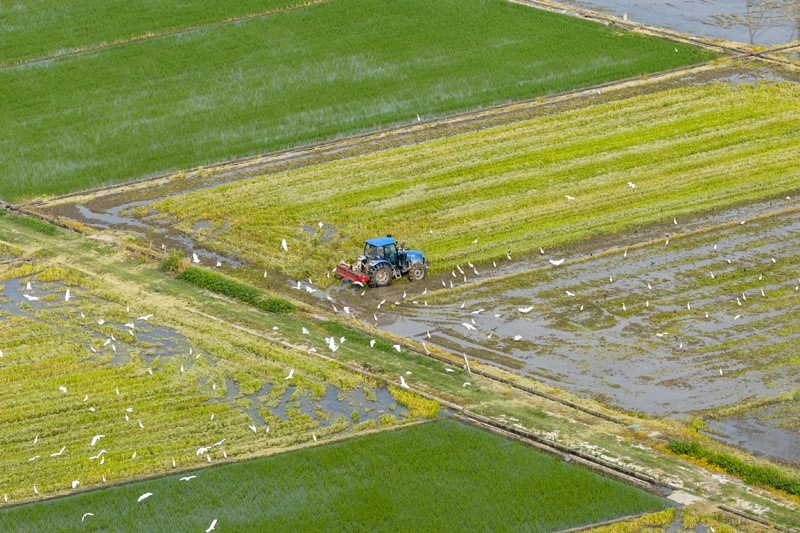 7月14日,在浙江省余姚市黃家埠鎮(zhèn)五車(chē)堰村,農(nóng)民駕駛農(nóng)機(jī)翻耕農(nóng)田(無(wú)人機(jī)照片)。