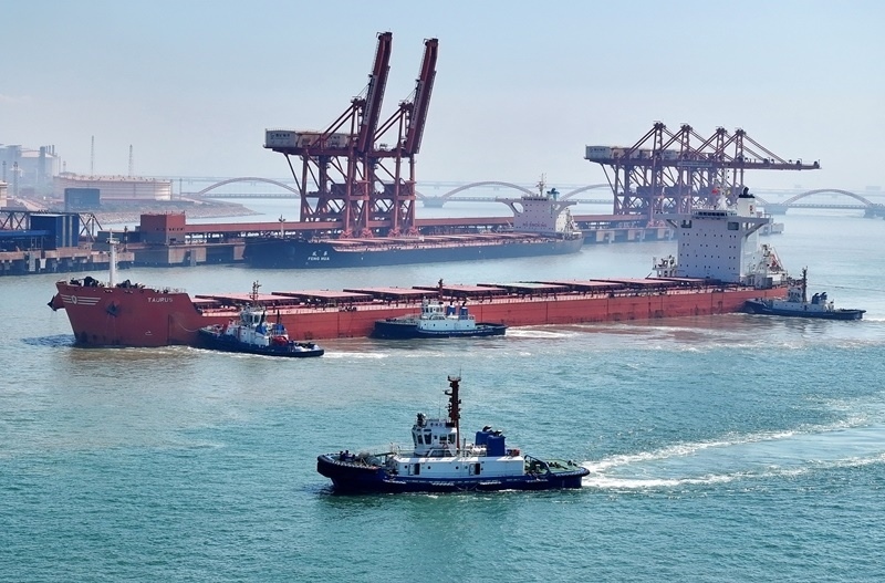 7月18日,輪船在拖輪的協(xié)助下向唐山港曹妃甸港區(qū)礦石碼頭靠泊(無(wú)人機(jī)照片)。