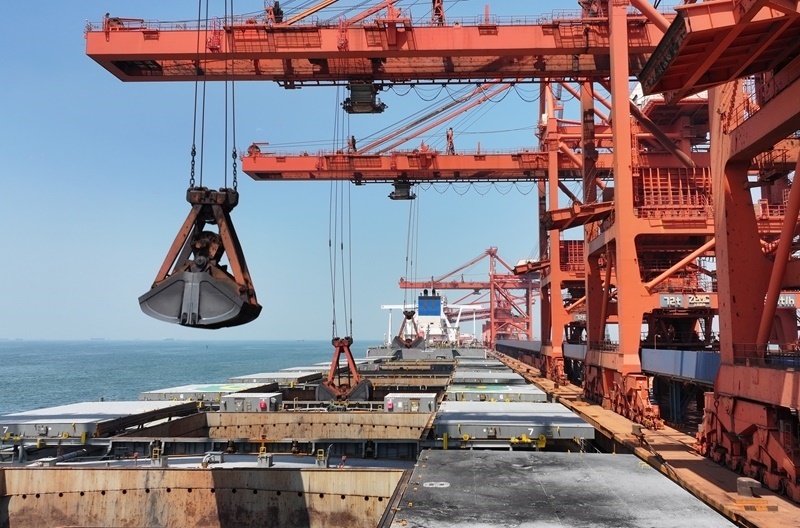 7月18日,一艘輪船靠泊在唐山港曹妃甸港區(qū)礦石碼頭卸載礦物(無(wú)人機(jī)照片)。