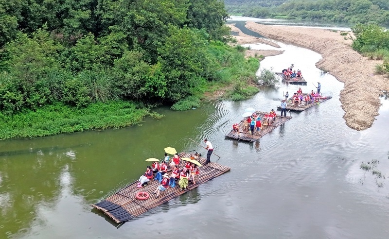 7月25日,游客在浙江省臺州市仙居縣永安溪乘坐竹筏漂流(無人機(jī)照片)。