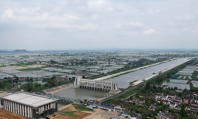 這是7月27日拍攝的引江濟(jì)淮鳳凰頸泵站(無(wú)人機(jī)照片)。