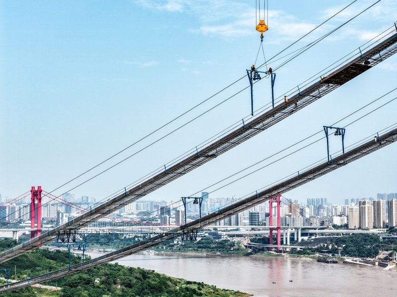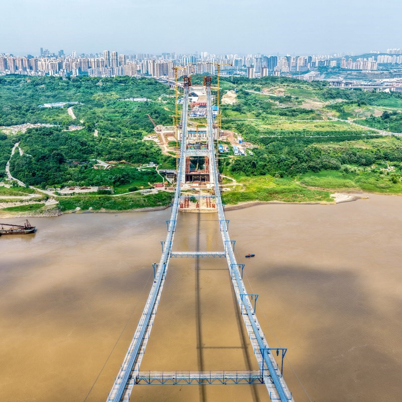 當(dāng)日,由重慶城投集團(tuán)投資、城投建設(shè)公司組織建設(shè)、中國鐵建大橋局承建的黃桷沱長江大橋順利完成主纜架設(shè)工作,標(biāo)志著大橋建設(shè)即將進(jìn)入鋼桁梁吊裝工序。黃桷沱長江大橋全長1260米,主跨765米,為單跨懸吊雙塔三跨連續(xù)鋼桁梁懸索橋,是國內(nèi)最大跨徑公軌兩用懸索橋。黃桷沱長江大橋是渝長高速復(fù)線連接道工程的控制性節(jié)點(diǎn)工程,建成后將成為聯(lián)系重慶主城區(qū)長江南北兩岸的重要交通干道。
