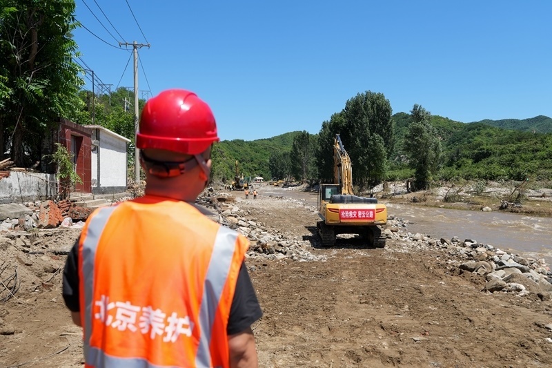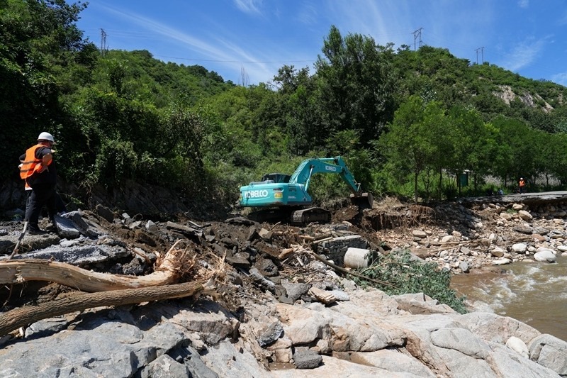 7月30日,在北京市密云區(qū)馮家峪鎮(zhèn),道路搶修人員清理河道。