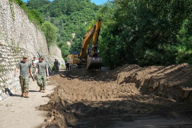 7月30日,在北京市密云區(qū)馮家峪鎮(zhèn),道路搶修人員清理道路上的雜物。