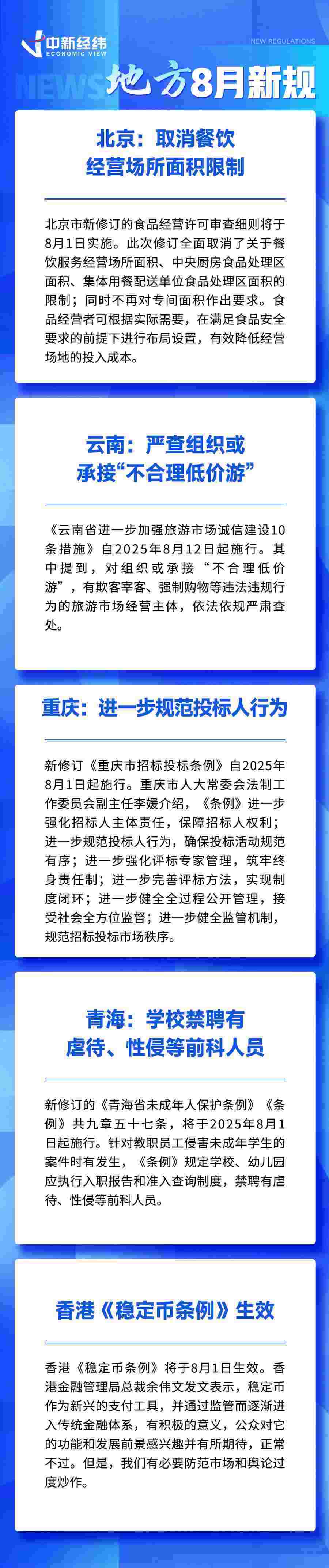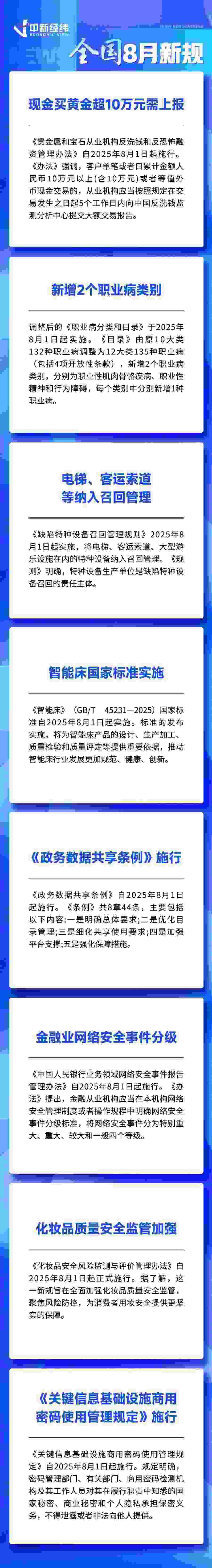 中新經(jīng)緯7月30日電 (熊思怡)現(xiàn)金買(mǎi)黃金超10萬(wàn)元需上報(bào)、新增2個(gè)職業(yè)病類(lèi)別、北京取消餐飲經(jīng)營(yíng)場(chǎng)所面積限制……8月,這些新規(guī)事關(guān)你我,一起來(lái)看。