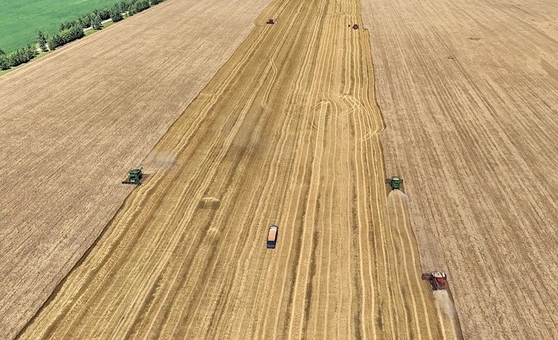 8月5日,位于黑龍江省五大連池市的大慶油田農(nóng)場調(diào)動多臺聯(lián)合收割機(jī)搶收小麥(無人機(jī)照片)。