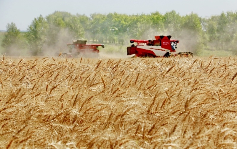 8月5日,位于黑龍江省五大連池市的大慶油田農(nóng)場調(diào)動多臺聯(lián)合收割機(jī)搶收小麥。