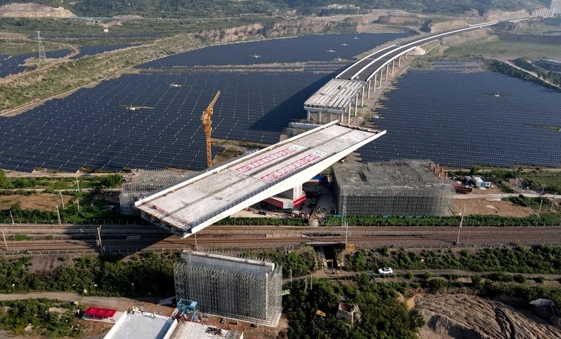 這是8月11日拍攝的河南省濟源市沿太行山高速公路跨焦柳鐵路立交橋轉(zhuǎn)體施工現(xiàn)場。