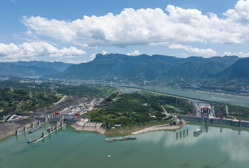 8月16日,在湖北省宜昌市,船舶有序通過三峽雙線五級(jí)船閘和三峽升船機(jī)(無人機(jī)照片)。