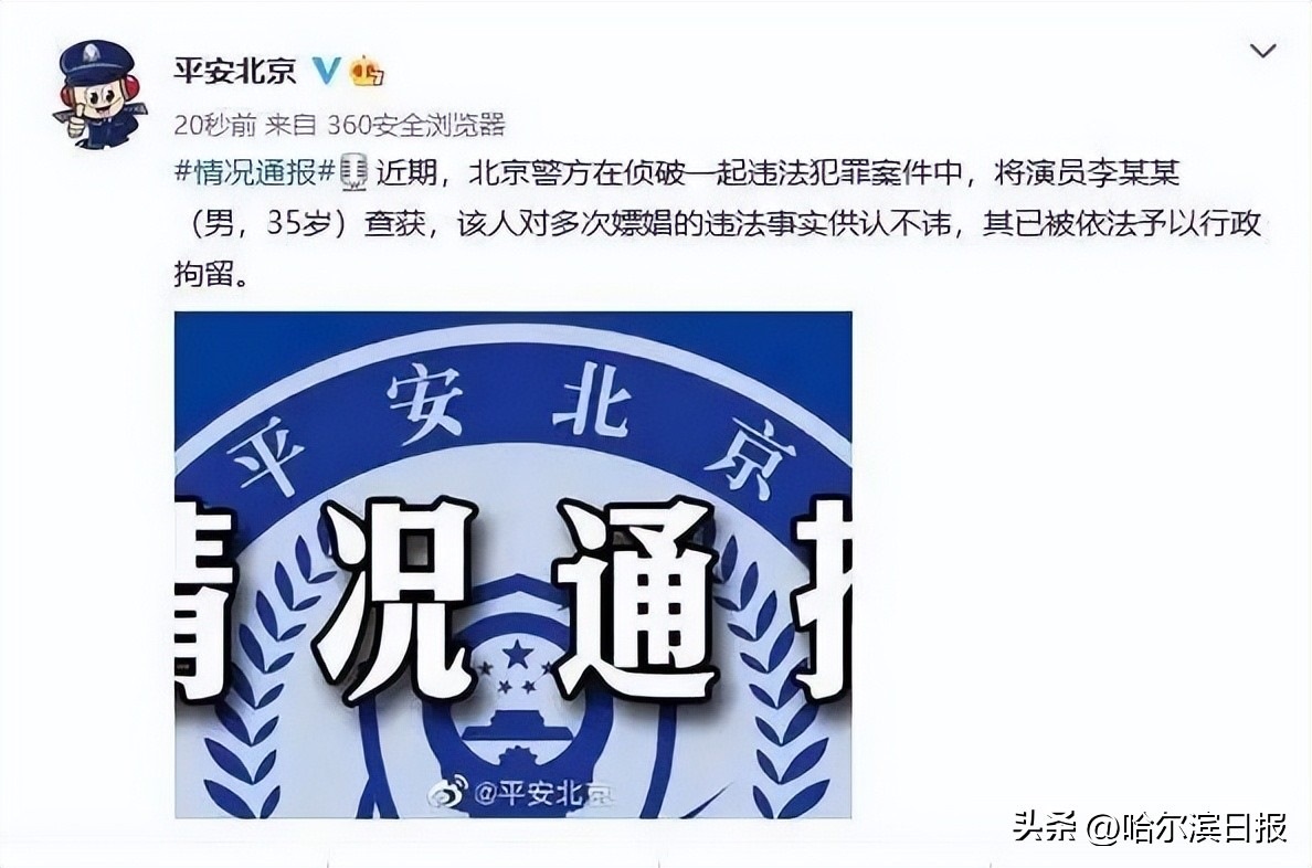 據(jù)此前報道,2022年,北京警方在偵破一起違法犯罪案件中,將演員李某某(男,35歲)查獲,該人對多次嫖娼的違法事實供認(rèn)不諱,其已被依法予以行政拘留。