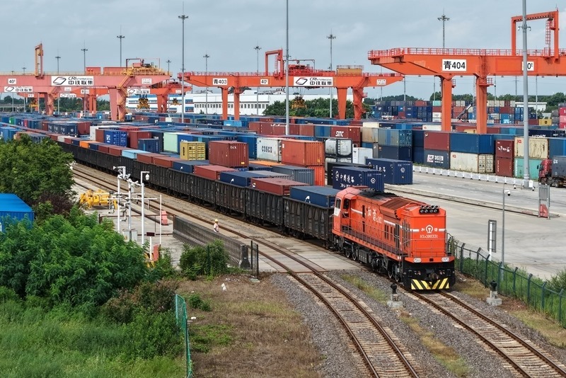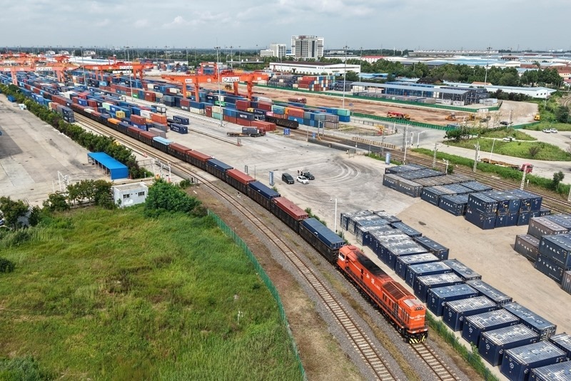 8月27日,一列貨運(yùn)列車駛?cè)胛挥谏虾鲜痉秴^(qū)內(nèi)的中國(guó)-上海合作組織地方經(jīng)貿(mào)合作示范區(qū)多式聯(lián)運(yùn)中心(無人機(jī)照片)。
