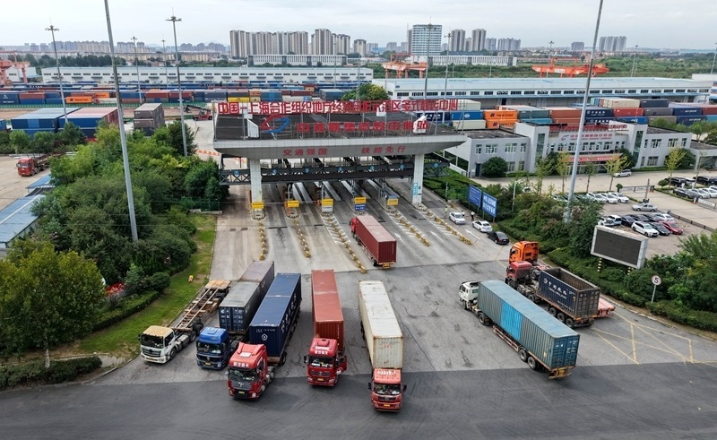 8月27日,貨運(yùn)卡車進(jìn)出位于上合示范區(qū)內(nèi)的中國(guó)-上海合作組織地方經(jīng)貿(mào)合作示范區(qū)多式聯(lián)運(yùn)中心(無人機(jī)照片)。