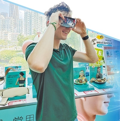 在深圳福田區(qū)華強(qiáng)北群星廣場(chǎng)購物中心,來自德國的小伙子凱試戴電子眼部按摩儀。