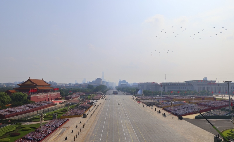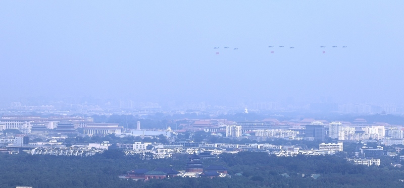 9月3日,紀(jì)念中國(guó)人民抗日戰(zhàn)爭(zhēng)暨世界反法西斯戰(zhàn)爭(zhēng)勝利80周年大會(huì)在北京隆重舉行。這是空中護(hù)旗梯隊(duì)。