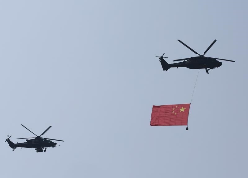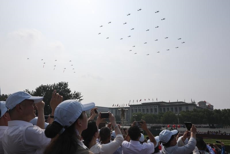 9月3日,紀(jì)念中國人民抗日戰(zhàn)爭暨世界反法西斯戰(zhàn)爭勝利80周年大會在北京隆重舉行。這是空中護(hù)旗梯隊。