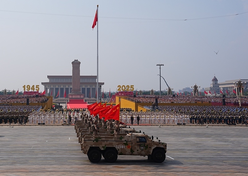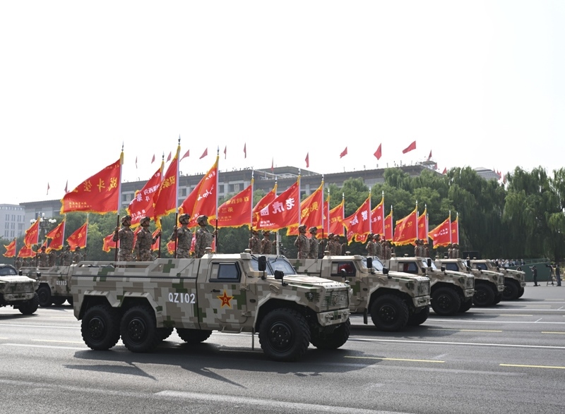9月3日,紀念中國人民抗日戰(zhàn)爭暨世界反法西斯戰(zhàn)爭勝利80周年大會在北京隆重舉行。這是戰(zhàn)旗方隊接受檢閱。