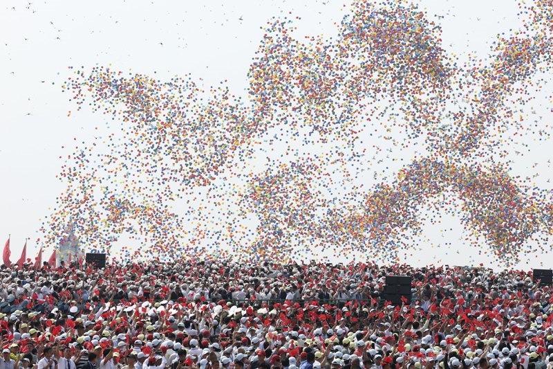 9月3日,紀念中國人民抗日戰(zhàn)爭暨世界反法西斯戰(zhàn)爭勝利80周年大會在北京隆重舉行。這是紀念大會現(xiàn)場放飛氣球。