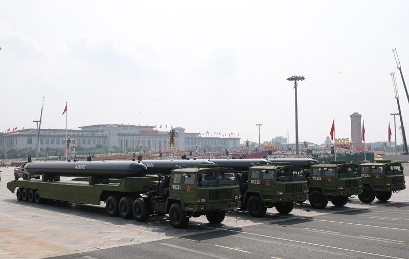 9月3日,紀念中國人民抗日戰(zhàn)爭暨世界反法西斯戰(zhàn)爭勝利80周年大會在北京隆重舉行。這是高超聲速導彈方隊接受檢閱。