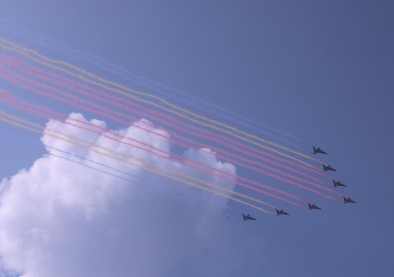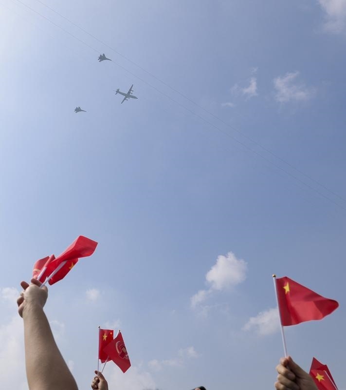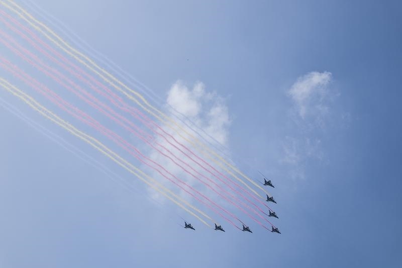 9月3日,紀(jì)念中國(guó)人民抗日戰(zhàn)爭(zhēng)暨世界反法西斯戰(zhàn)爭(zhēng)勝利80周年大會(huì)在北京隆重舉行。這是教練機(jī)梯隊(duì)接受檢閱。