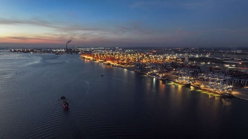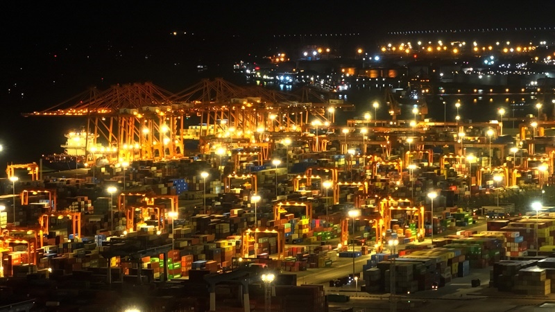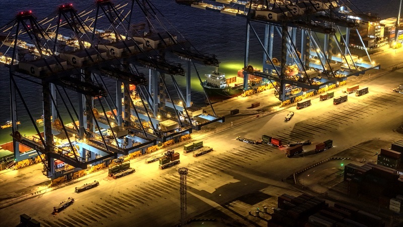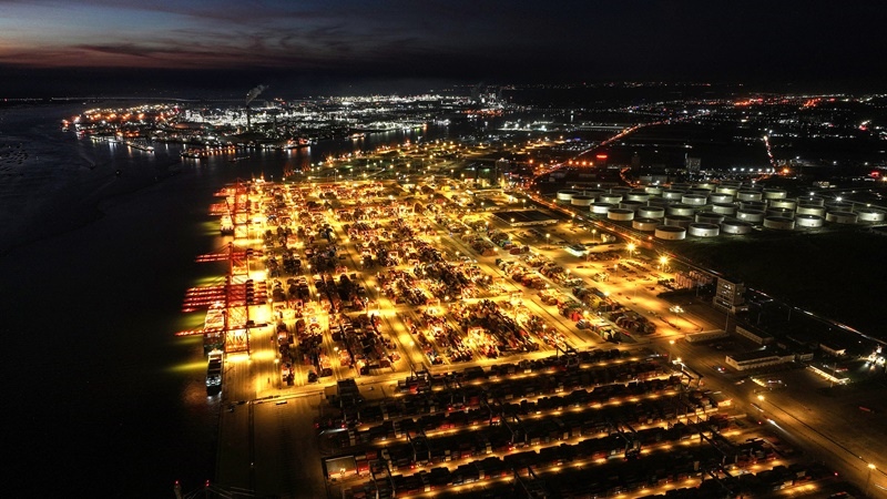 正在進(jìn)行晚間作業(yè)的欽州港碼頭(9月4日攝,無(wú)人機(jī)照片)。