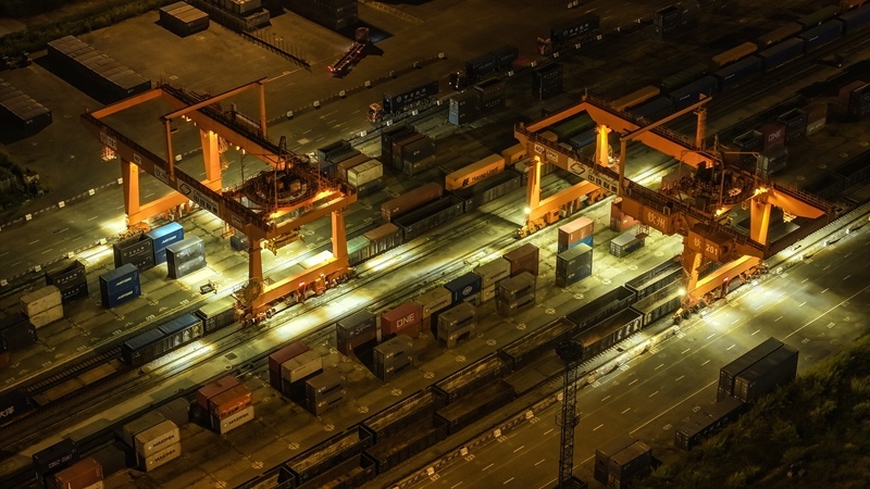 欽州鐵路集裝箱中心站塔吊在為貨列裝運(yùn)集裝箱(9月4日攝,無(wú)人機(jī)照片)。