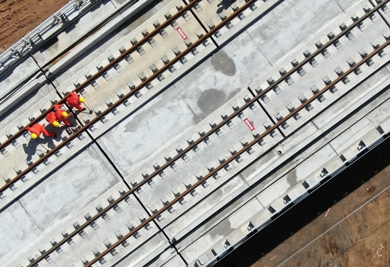 9月8日,施工車輛在西十高鐵西安東至藍(lán)田區(qū)間鋪設(shè)無縫鋼軌(無人機(jī)照片)。