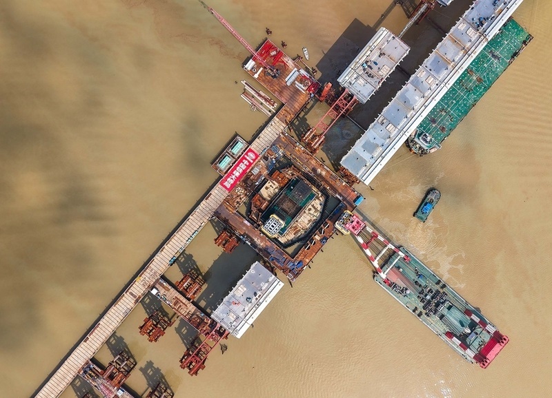 10月10日,浮吊船在珠江口吊裝萬(wàn)龍大橋主塔首節(jié)段鋼塔,這是主塔鋼塔柱與混凝土塔座的過(guò)渡關(guān)鍵結(jié)構(gòu)(無(wú)人機(jī)照片)。