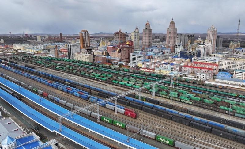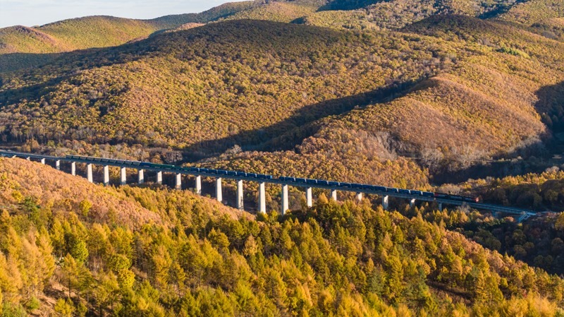 10月18日,一列滿載進(jìn)口物資的貨物列車駛向中國鐵路哈爾濱局集團(tuán)有限公司綏芬河站(無人機照片)。