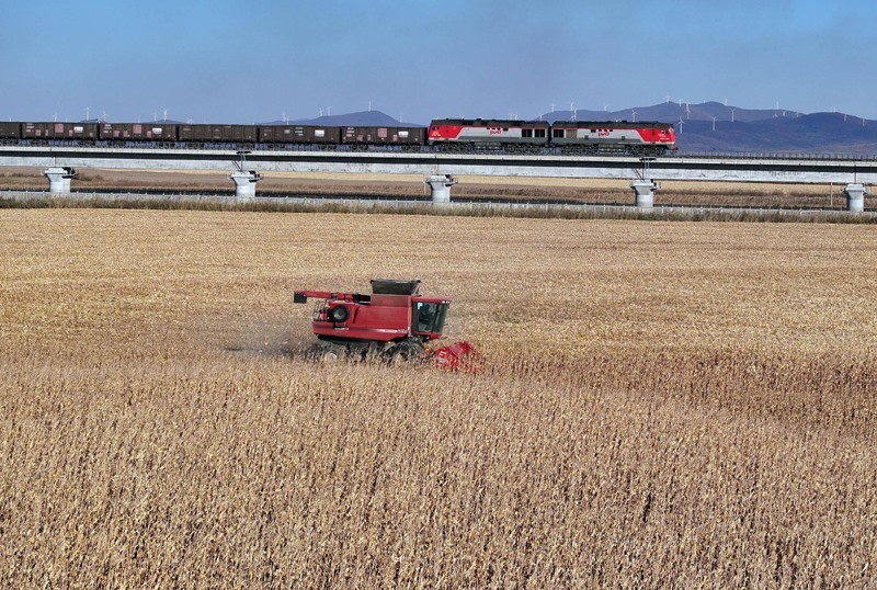 10月16日,滿載進(jìn)口物資的貨物列車駛向中國鐵路哈爾濱局集團(tuán)有限公司同江北站(無人機照片)。