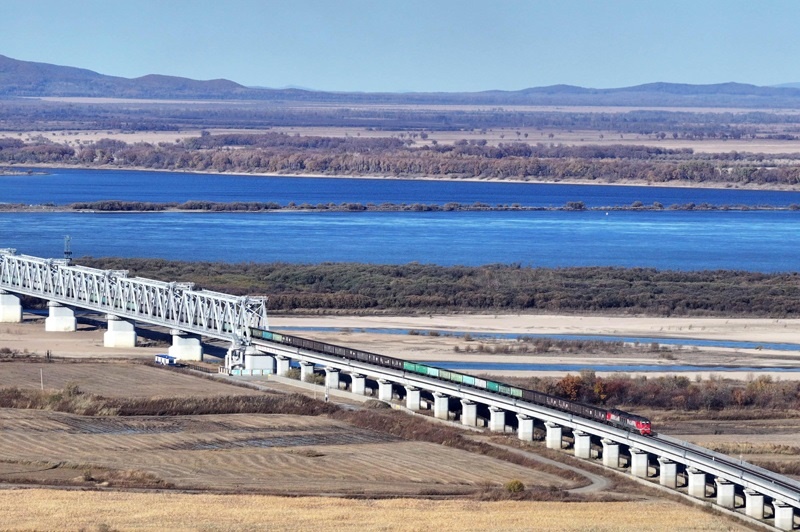 10月16日,滿載進(jìn)口物資的貨物列車通過同江鐵路大橋駛向中國鐵路哈爾濱局集團(tuán)有限公司同江北站(無人機照片)。